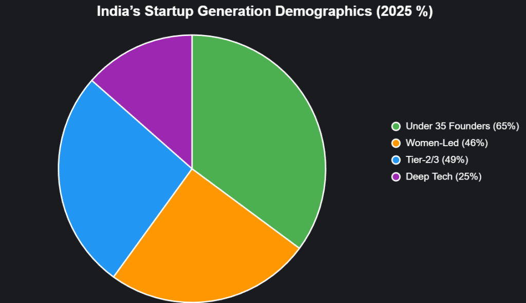This is India’s Startup Generation: 65% founders under 35, 46% women-led (73,000 ventures), and 49% rising from Tier-2/3 cities, per DPIIT’s Prabhaav Factbook 2025. They’re not just building apps; they’re rewriting the national economy—$450 billion digital GDP, 17.6 lakh direct jobs, $10 billion exports, and a projected $1 trillion innovation economy by 2030. Amid 90% failures and $7.7 billion funding winters, their stories—rooted in grit, digital nativity, and social purpose—shine with hope.