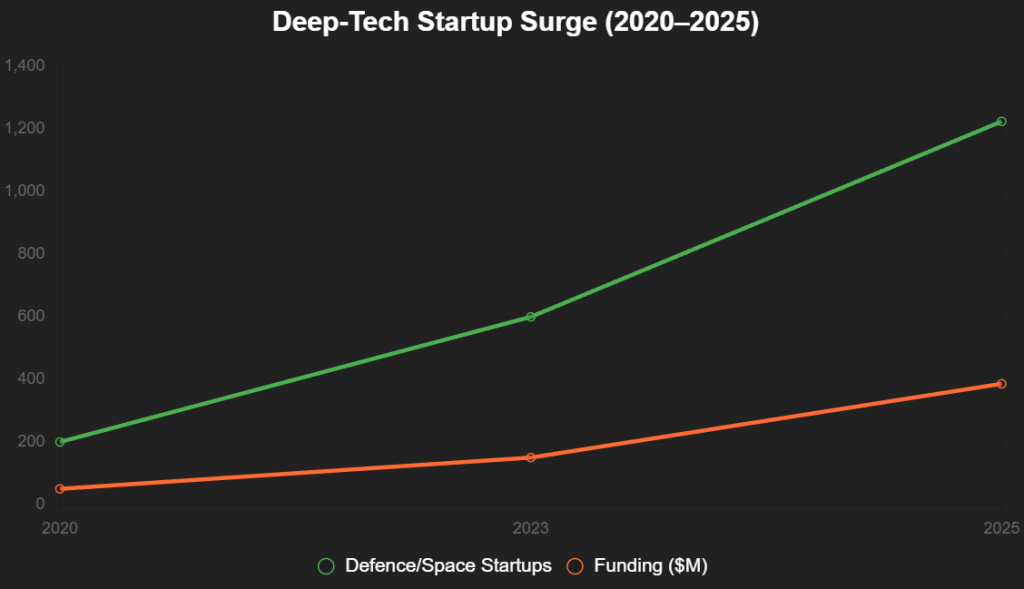 Deep-tech startups exploded: 1,000+ defence (up 5x), 225 space (up 6x), per Tracxn. Funding: $386 million AI-defence (89% startups integrate AI), $233.5 million corporate-backed. Drones dominate (71%, $305 million)—counter-drone systems priority post-Operation Sindoor (May 2025 drone-led India-Pakistan clash).